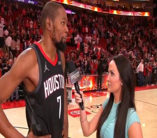 记者:“你最想听到丰田中心的观众们喊些什么口号呢?”(杜兰特笑,全场欢呼)